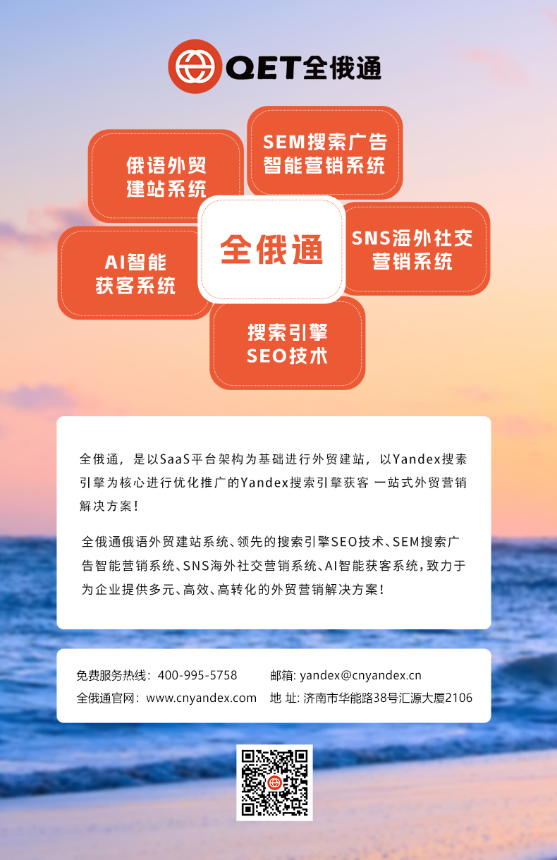 最后,鼓勵(lì)企業(yè)要積極拓展俄羅斯市場(chǎng),同時(shí)也提醒企業(yè)在推廣過程中要始終把握市場(chǎng)需求和特點(diǎn),靈活調(diào)整策略和方法,以獲得更好的推廣效果和商業(yè)回報(bào)。強(qiáng)調(diào)了全俄通致力于構(gòu)建更加緊密的中俄商貿(mào)合作關(guān)系,同時(shí)也希望更多的國(guó)內(nèi)企業(yè)能夠積極拓展俄羅斯市場(chǎng),實(shí)現(xiàn)雙方互利共贏的局面。
